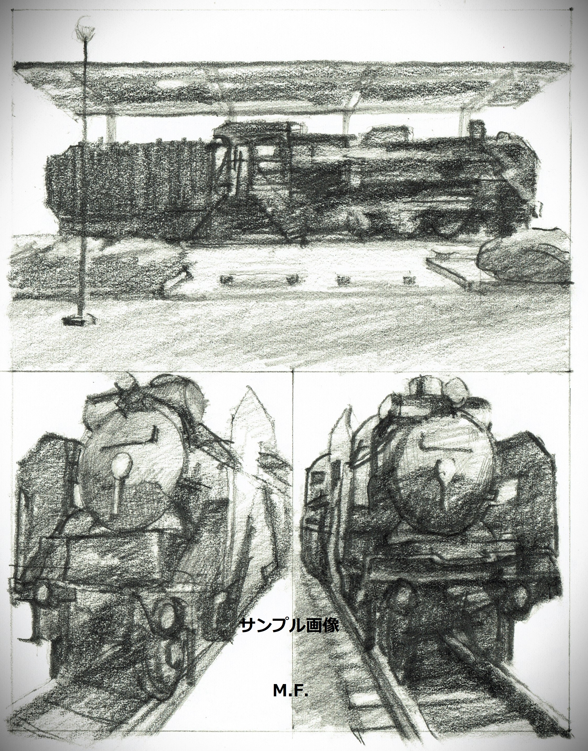 いて、今回は機関車をモチーフにしました。しかも、3方向から描かれていています。